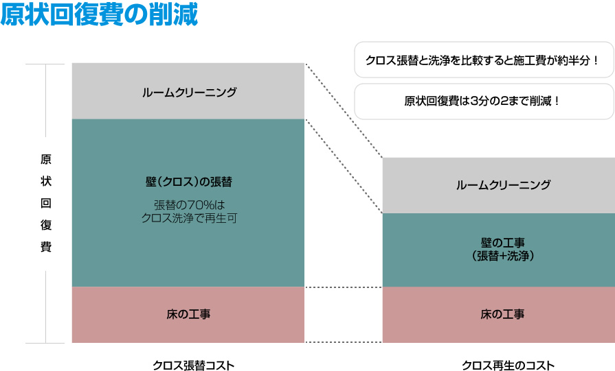 マンションオーナー様のビニルクロス(壁紙)貼替えに対する問題点が多く、『退去時の原状回復でクロスを毎回貼替えるのではコストが非常にかかる』『工期が長くすぐに物件案内が出来ない』『糊のニオイや健康面の問題』『産業廃棄物処理問題』などがありました。 ビルメンテナンス業で培った技術を改良し、費用をかけず、工期が早く、ゴミをあまり排出しないクロス再生を考案しました。